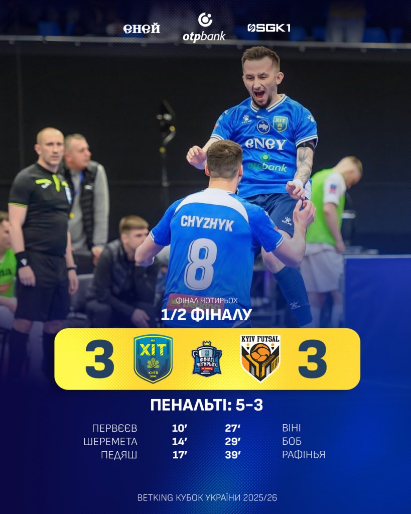 У півфінальному матчі Кубка України 2025/26 “ХІТ” переграв у серії пенальті “Київ Футзал” та пробився у Фінал турніру! Наші ідеально провели перший тайм, забивши три м’ячі (Владислав Первєєв, Руслан Шеремета, Олександр Педяш).