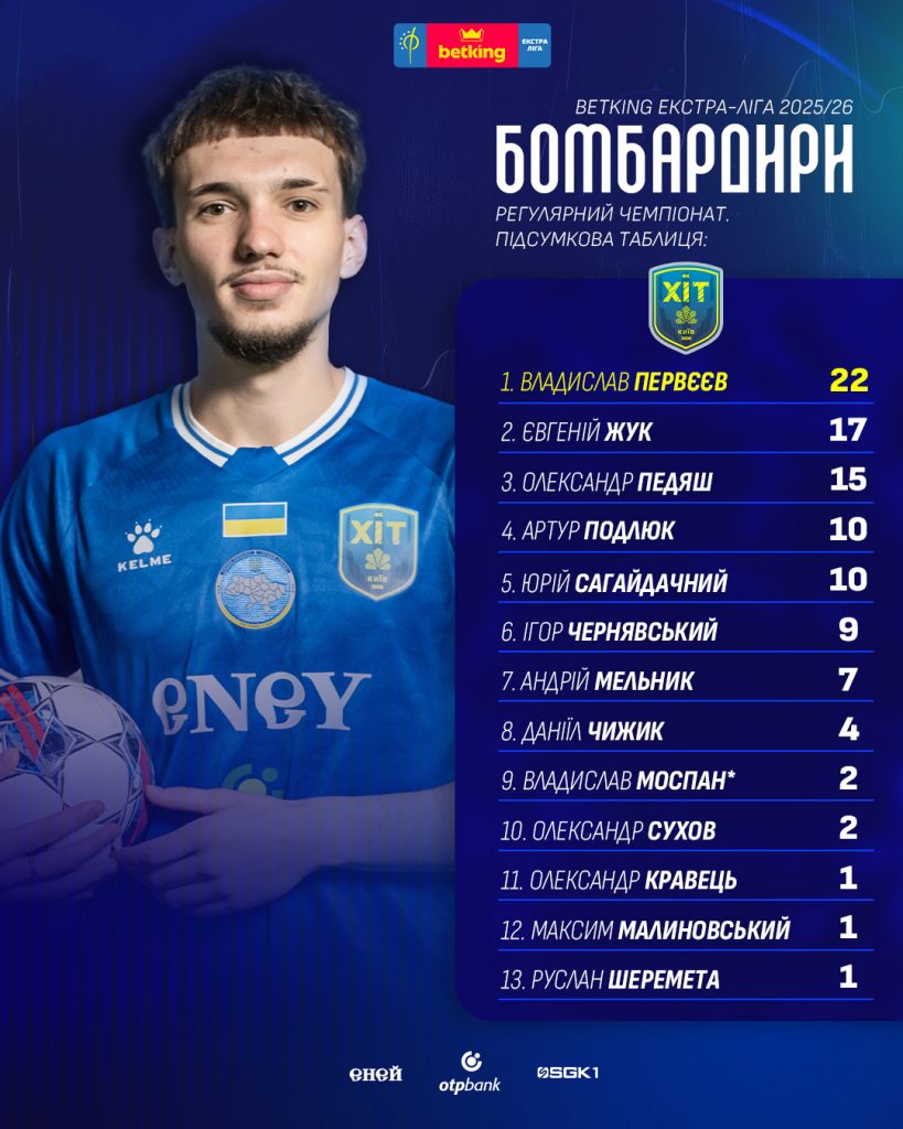А індивідуальну статистику розпочинаємо із заліку бомбардирів – Владислав Первєєв став не тільки найкращим голеадором “ХІТа” (22 м’ячі), а й всього регулярного чемпіонату. У ТОП-3 першого етапу Екстра-ліги також увійшли Келвін Кел з “Київ Футзал” (18), а також Євгеній Жук та Олександр Дичук з “Урагана” (у обох по 17 голів).