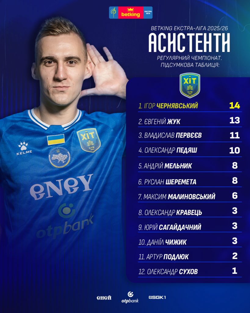 Продовжуємо підбивати підсумки індивідуальних дій наших гравців після завершення регулярного чемпіонату та переходимо до такого важливого заліку, як гольові паси. Найкращим асистентом не тільки “ХІТа”, а всього першого етапу турніру став наш капітан Ігор Чернявський, у якого 14 результативних передач на гол. У ТОП-3 також увійшли Євгеній Жук (13) та Андрій Британ з “Урагана” (12). У трьох гравців по 11 асистів – це найкращий бомбардир регулярки Влад Первєєв, Василь Блащук (Фурнітура) та Вадим Данилюк (Сокіл). По 10 передач мають наш Олександр Педяш, Петро Шотурма (Ураган), Віні (Київ Футзал) та Михайло Волянюк (Кардинал/Авангард).
